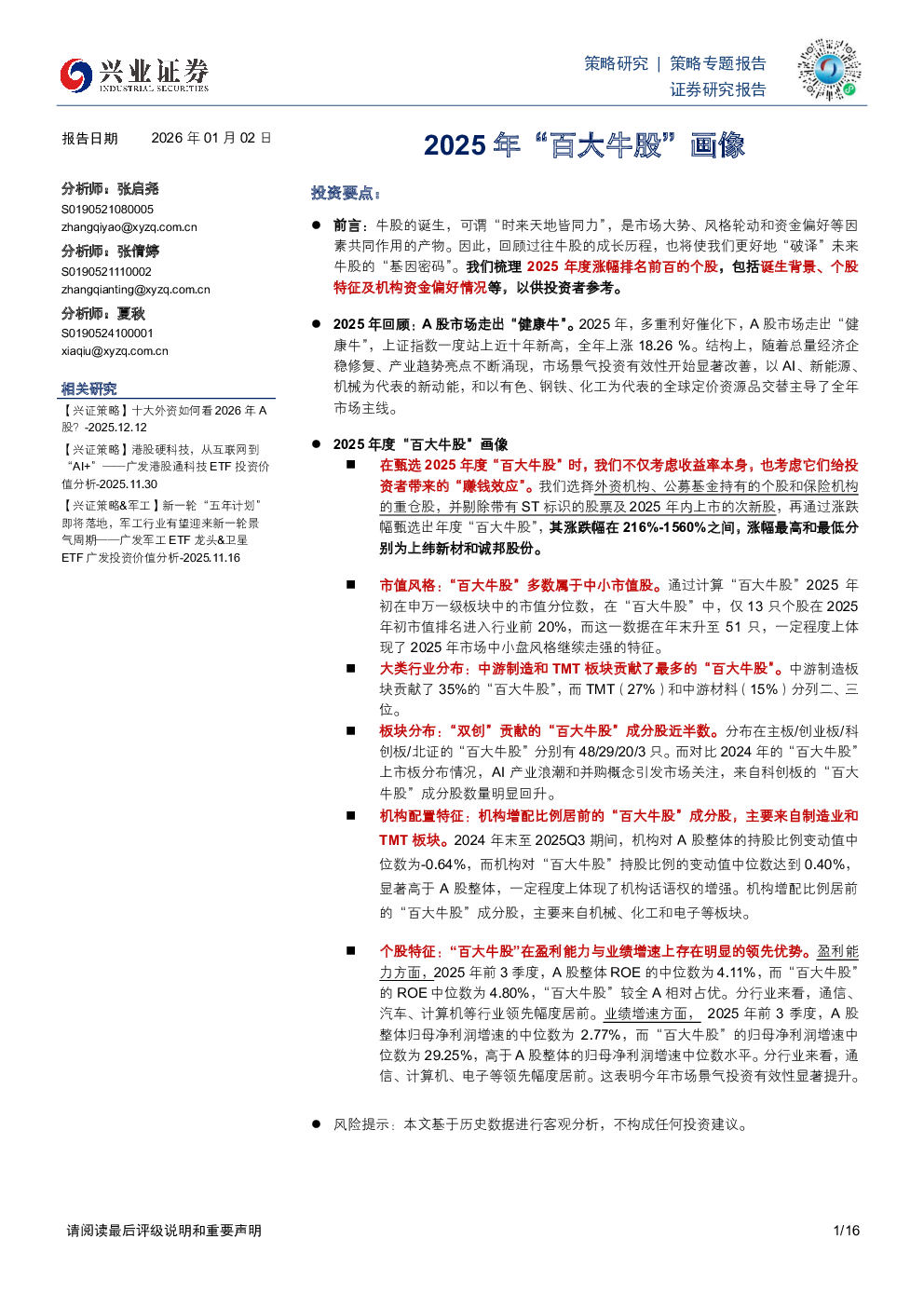 当前位置: 金融&保险&公司治理  >  银行/投融资  > 2025年“百大牛股”画像.pdf