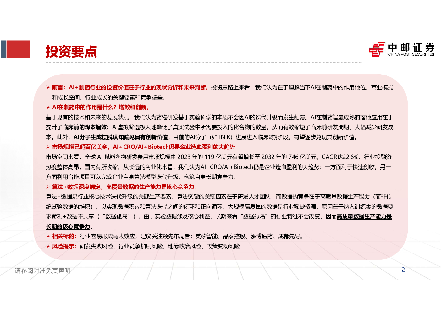 当前位置: 健康与医疗  >  智慧AI医疗  > AI制药:从降本增效到分子创新,数据生产构筑长期壁垒.pdf