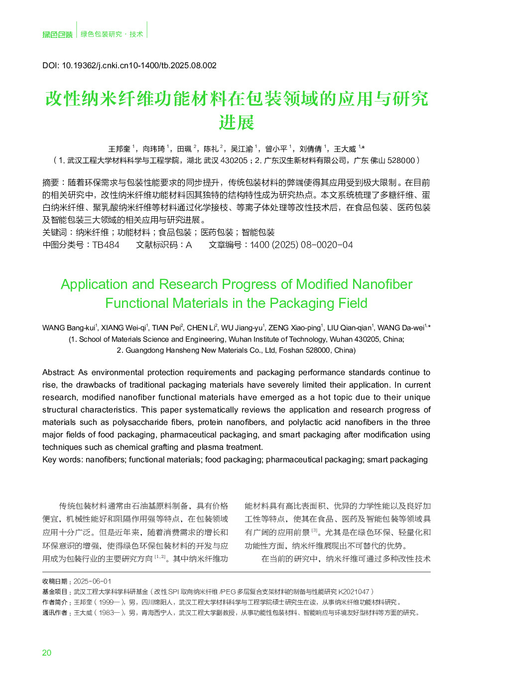 当前位置: 微、纳米和生物技术  >  纳米生物技术  > 改性纳米纤维功能材料在包装领域的应用与研究进展.pdf
