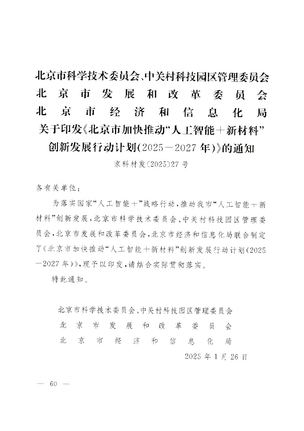 北京市科学技术委员会、中关村科技园区管理委员会 北京市发展和改革委员会 北京市经济和信息化局 关于印发《北京市加快推动“人工智能+新材料”创新发展行动计划(2025―2027年).pdf