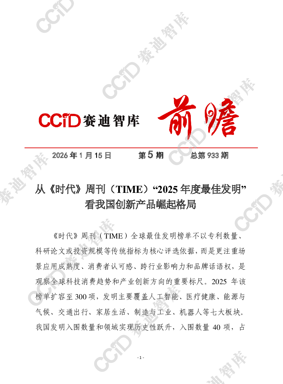 当前位置: 金融&保险&公司治理  >  行业分析报告  > 赛迪前瞻2026年第5期(总933期):从《时代》周刊(TIME)“2025年度最佳发明”看我国创新产品崛起格局-水印版.pdf